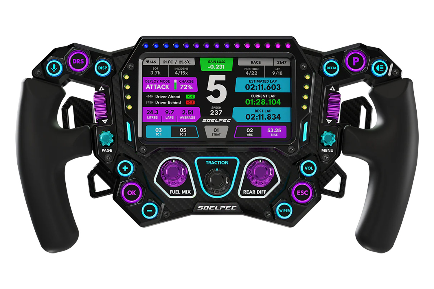 The Spectra XR is a steering wheel that’s a tad flashy, notably with its controls available in a choice of 5 colors, but also because of the RGB covering the buttons and other lighting effects.